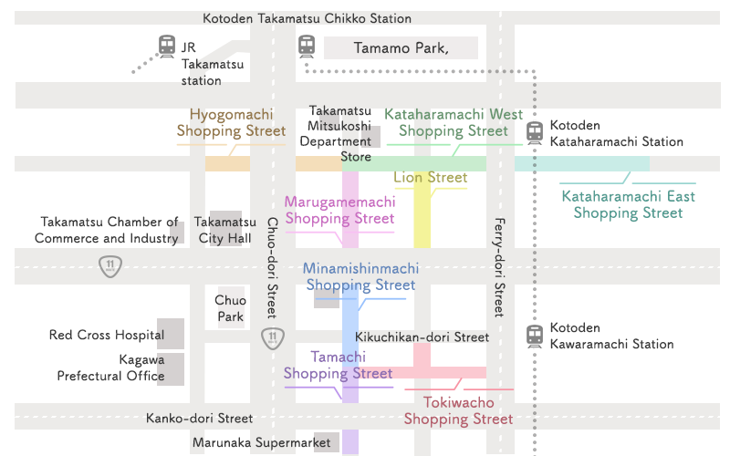 Marugamemachi was named after the merchants from Marugame who arrived in this area in 1588 when Chikamasa Ikoma was building Takamatsu Castle.